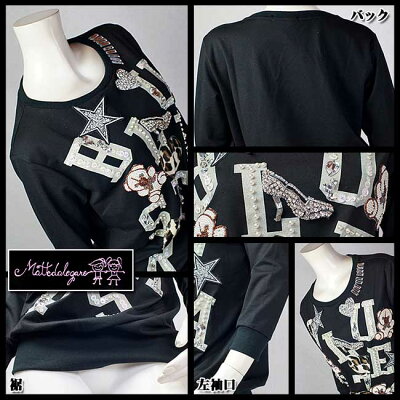 "Mattedalegare" ハートとビジューが可愛いトレーナー 正面/背面画像 キュートなハート シェイプ ステッチや星や熊のワッペンをあしらったブラック生地の七分袖トレーナー。